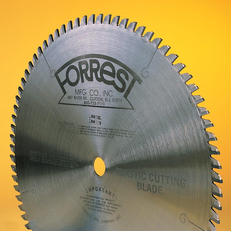 The large number of carbide teeth with a special modified triple-chip-grind (#11 tooth style) allows fast feeding of brittle acrylics with no chipping. On table saw, raise blade to cut cooler, lower blade to prevent chipping.